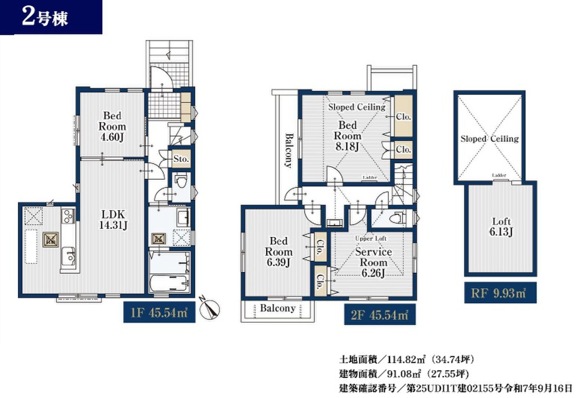 2号棟 間取り 3SLDK+ロフト 価格 8880万円 建物面積 91.08m2 土地面積 114.82m2 -