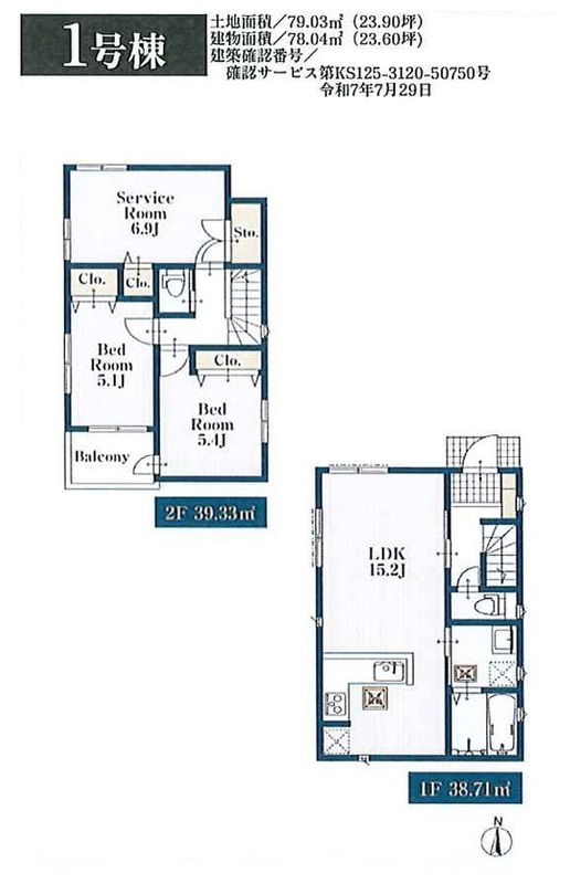 | 建物面積 | 78.04m2 | 土地面積 | 79.03m2(協定範囲有:1号棟一部事業用地部分有) |