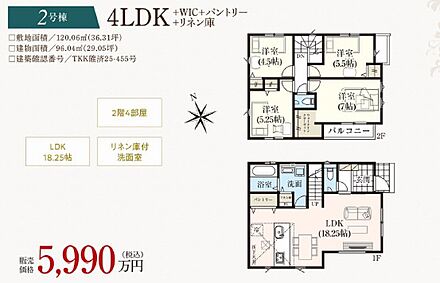 2号棟 間取り 4LDK+WIC+パントリー+リネン庫 価格 5990万円 建物面積 96.04m2 土地面積 120.06m2 -