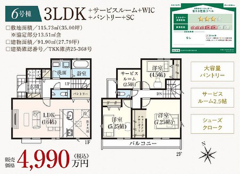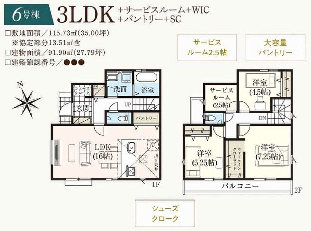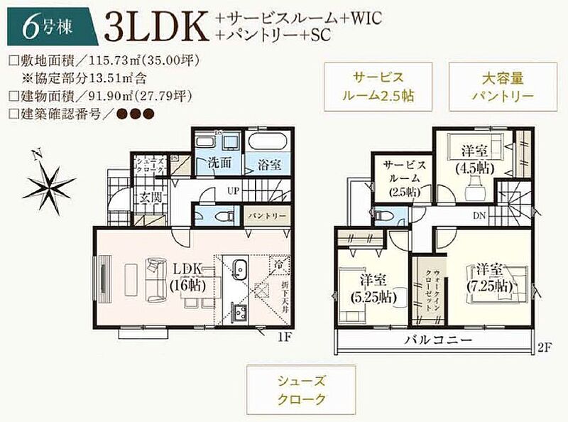 6号棟 間取り 3LDK+サービスルーム+WIC+パントリー+SIC 価格 4990万円 建物面積 91.90m2 土地面積 115.73m2(協定部分13.51m2含む) -