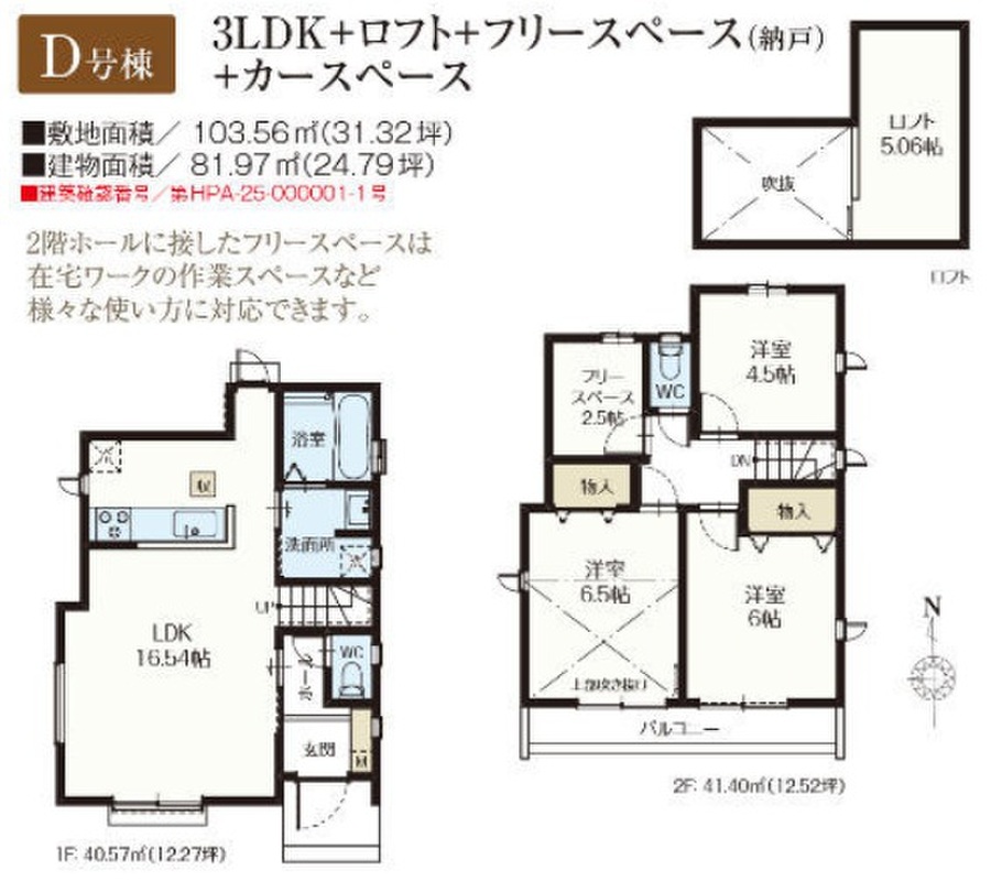 D号棟 間取り 3LDK+ロフト+フリースペース 価格 5890万円 建物面積 81.97m2 土地面積 103.56m2 -