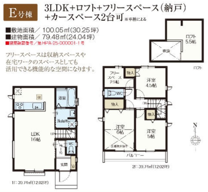 E号棟(ご成約済み) 間取り 3LDK+ロフト+フリースペース 価格 未定 建物面積 79.48m2 土地面積 100.05m2 -