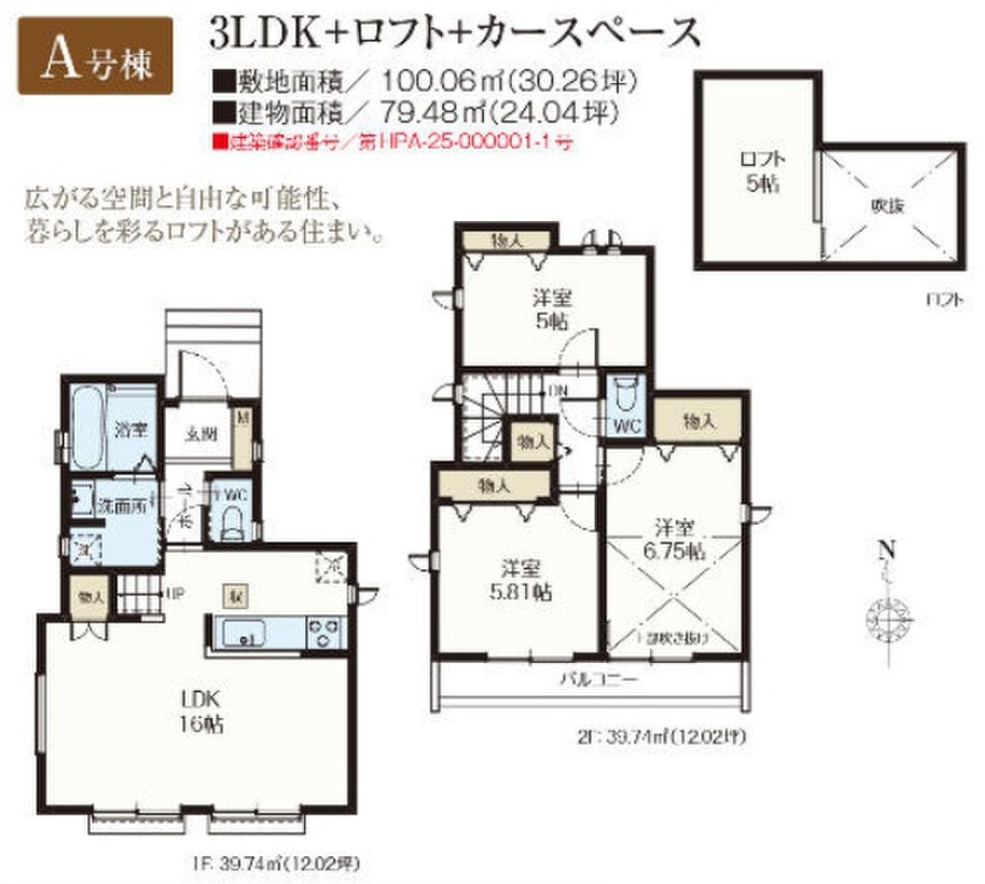 A号棟(ご成約済み) 間取り 3LDK+ロフト 価格 未定 建物面積 79.48m2 土地面積 100.06m2 -
