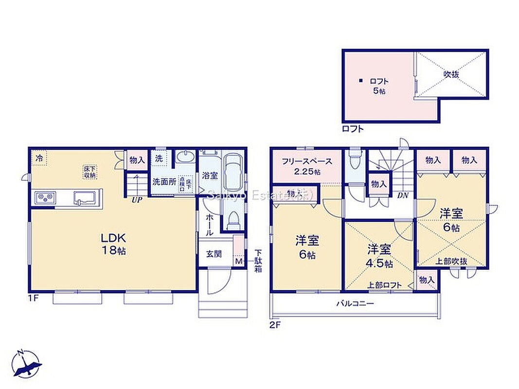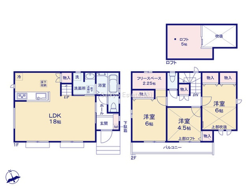 E号棟 間取り 3LDK+フリースペース(納戸)+ロフト 価格 5790万円 建物面積 85.91m2 土地面積 108.04m2 -
