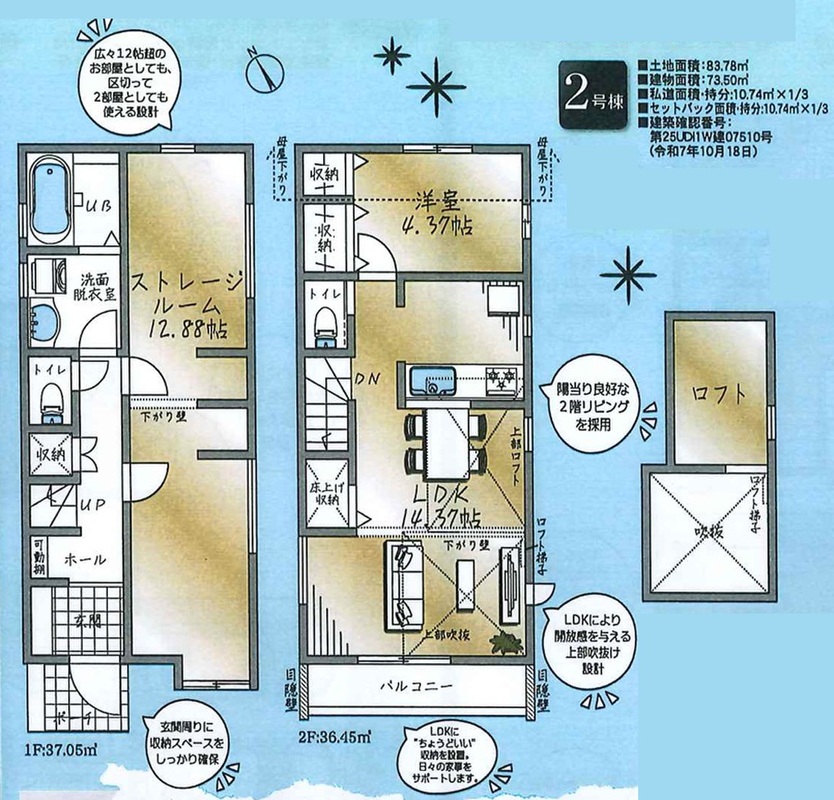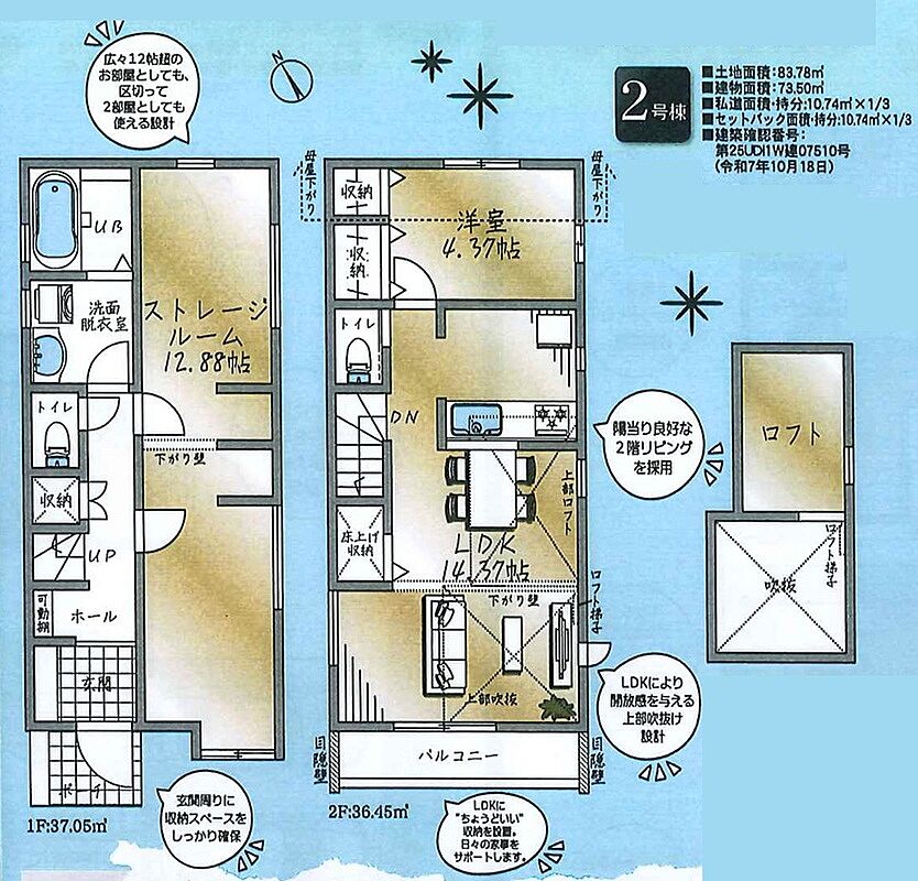 2号棟 間取り 1SLDK+ロフト 価格 5990万円 建物面積 73.50m2 土地面積 83.78m2 -