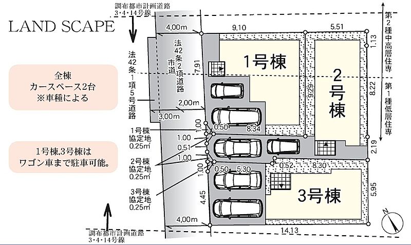 | 駐車場 | 2台 | 道路の幅員 | 北西側2.72m公道、私道持分10.74m2×各1/3、セットバック面積持分10.74m2×各1/3 |