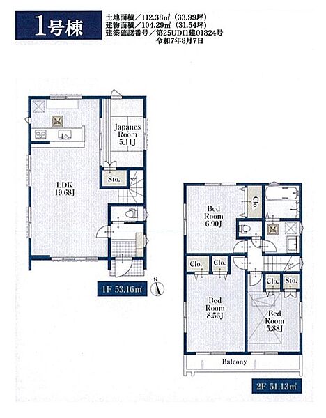 1号棟 間取り 4LDK+小屋裏収納 価格 6880万円 建物面積 104.29m2 土地面積 112.38m2