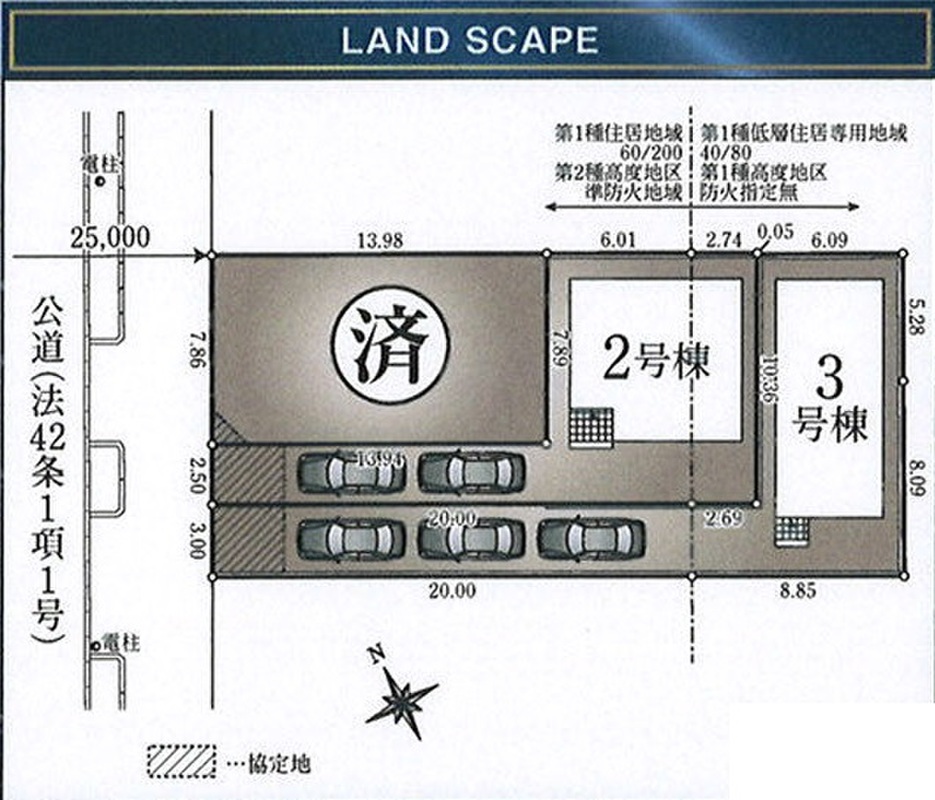 | 駐車場 | 2台 ~ 3台(2号棟(2台)、3号棟(3台)) | 道路の幅員 | 西側約25m公道 |