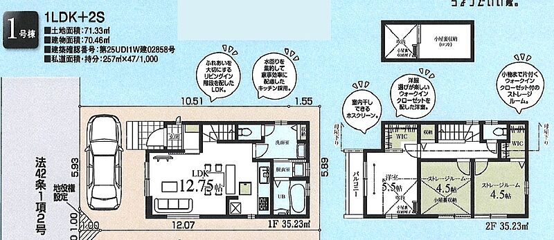 1号棟 間取り 1LDK+2S+2WIC+小屋裏収納 価格 4980万円 建物面積 70.46m2 土地面積 71.33m2