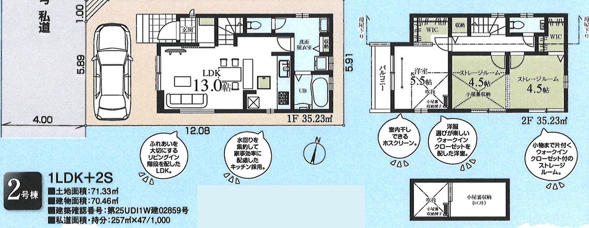 2号棟 間取り 1LDK+2S+2WIC+小屋裏収納 価格 4980万円 建物面積 70.46m2 土地面積 71.33m2 -