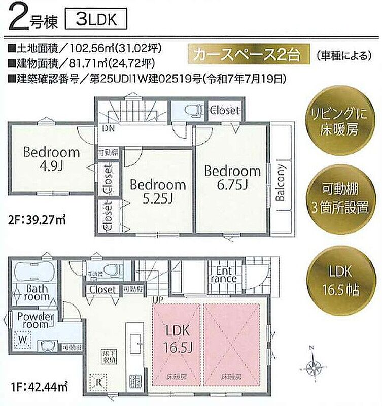 2号棟 間取り 3LDK 価格 7980万円 建物面積 81.71m2 土地面積 102.56m2