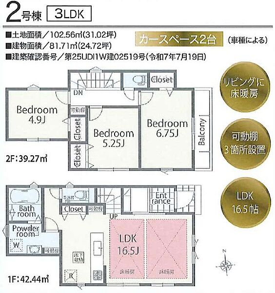 2号棟 間取り 3LDK 価格 7980万円 建物面積 81.71m2 土地面積 102.56m2 -