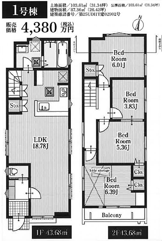 1号棟 間取り 4LDK+小屋裏収納 価格 4680万円 建物面積 87.36m2 土地面積 103.61m2 -