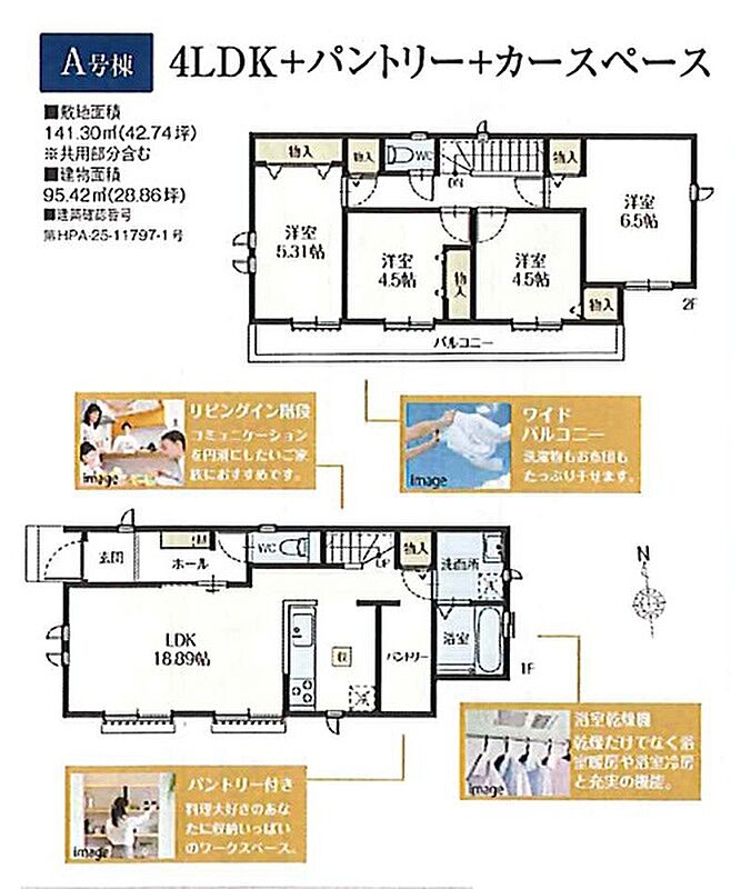 A号棟 間取り 4LDK+パントリー 価格 5290万円 建物面積 95.42m2 土地面積 141.30m2(共用部分含む)
