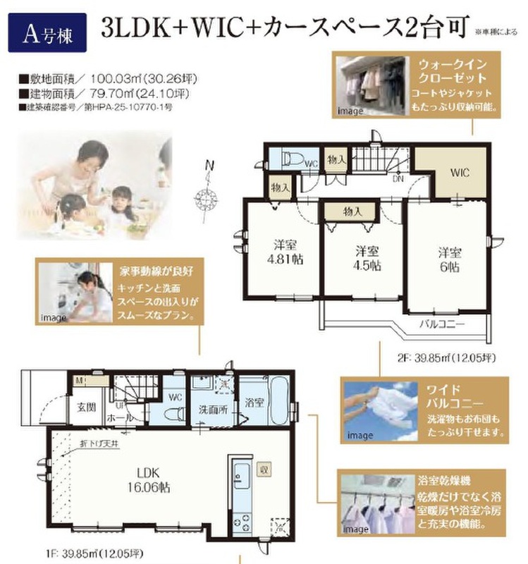 A号棟 間取り 3LDK+WIC+カースペース2台可 価格 6990万円 建物面積 79.70m2 土地面積 100.03m2 -