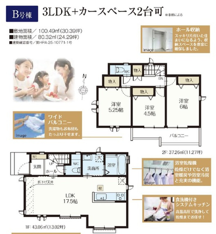 B号棟 間取り 3LDK+カースペース2台可 価格 7390万円 建物面積 80.32m2 土地面積 100.49m2 -