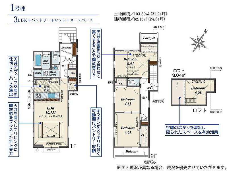 1号棟 間取り 3LDK+パントリー+ロフト 価格 5580万円 建物面積 82.15m2 土地面積 103.30m2