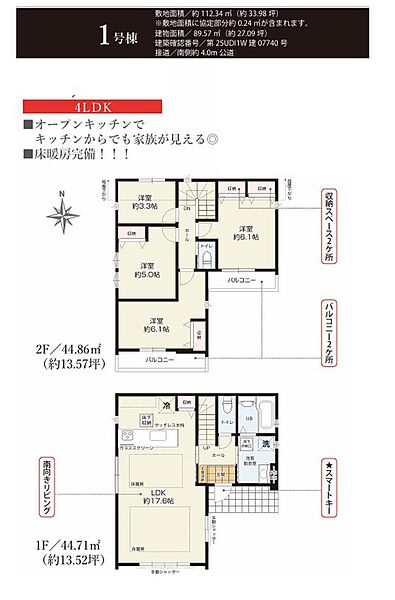 | 建物面積 | 89.57m2 | 土地面積 | 112.34m2(敷地面積に各協定部分約0.24m2を含みます) |