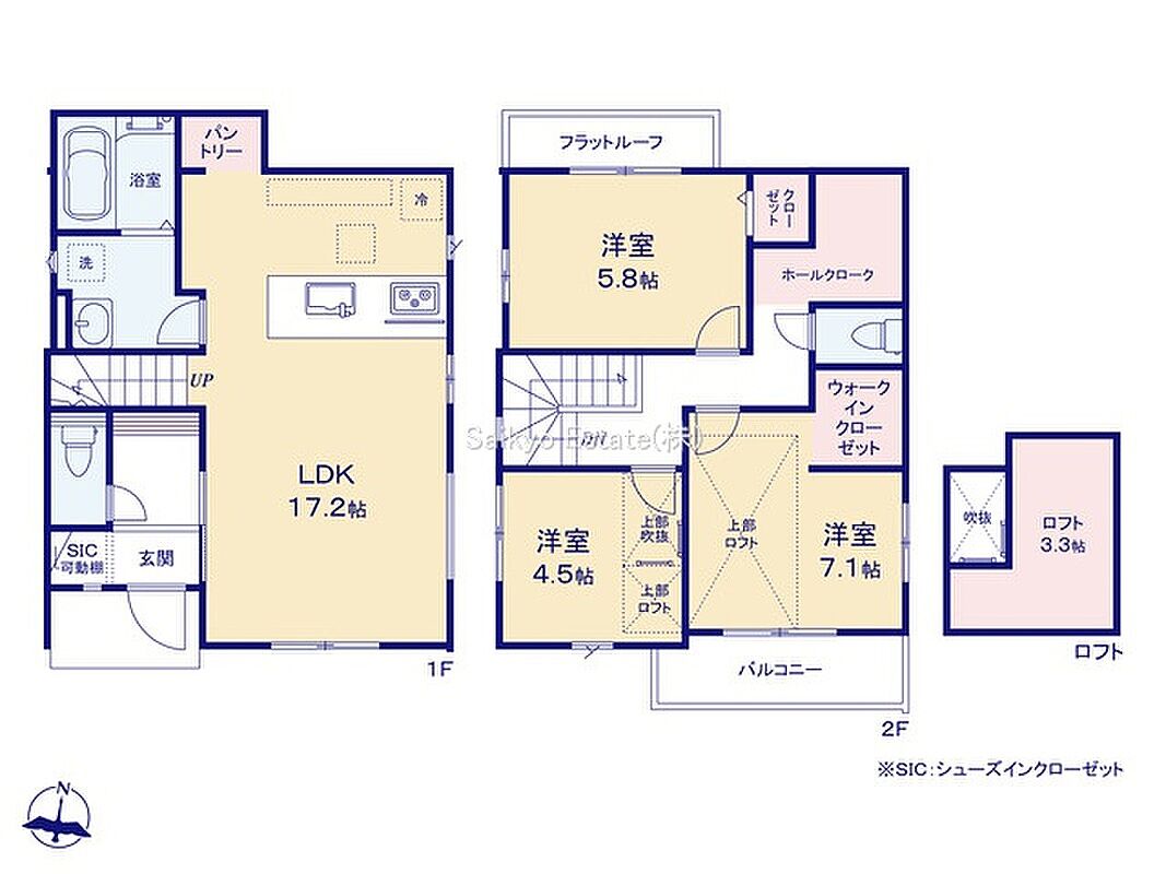 1号棟 間取り 3LDK+ロフト+パントリー+SIC+WIC+ホールクローク 価格 8799万円 建物面積 86.27m2 土地面積 100.64m2(共有地0.62m2含む) -
