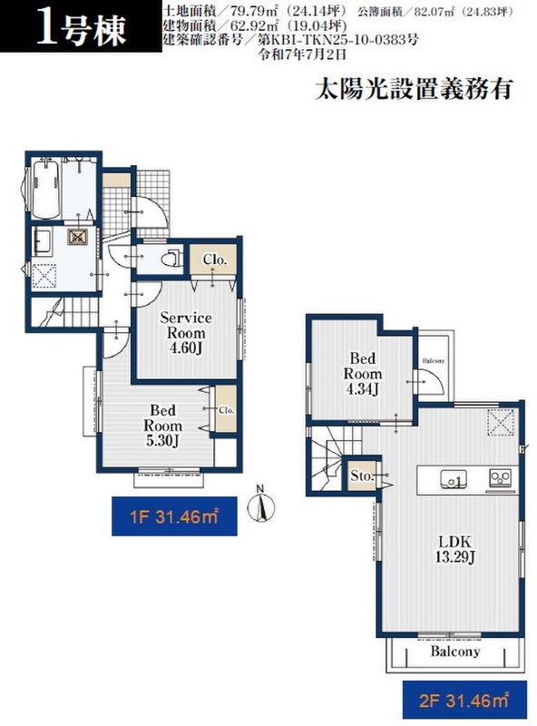 1号棟 間取り 2SLDK 価格 7280万円 建物面積 62.92m2 土地面積 79.79m2