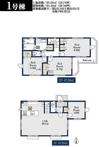 1号棟 間取り 4LDK+ロフト 価格 8480万円 建物面積 94.40m2 土地面積 95.00m2 -