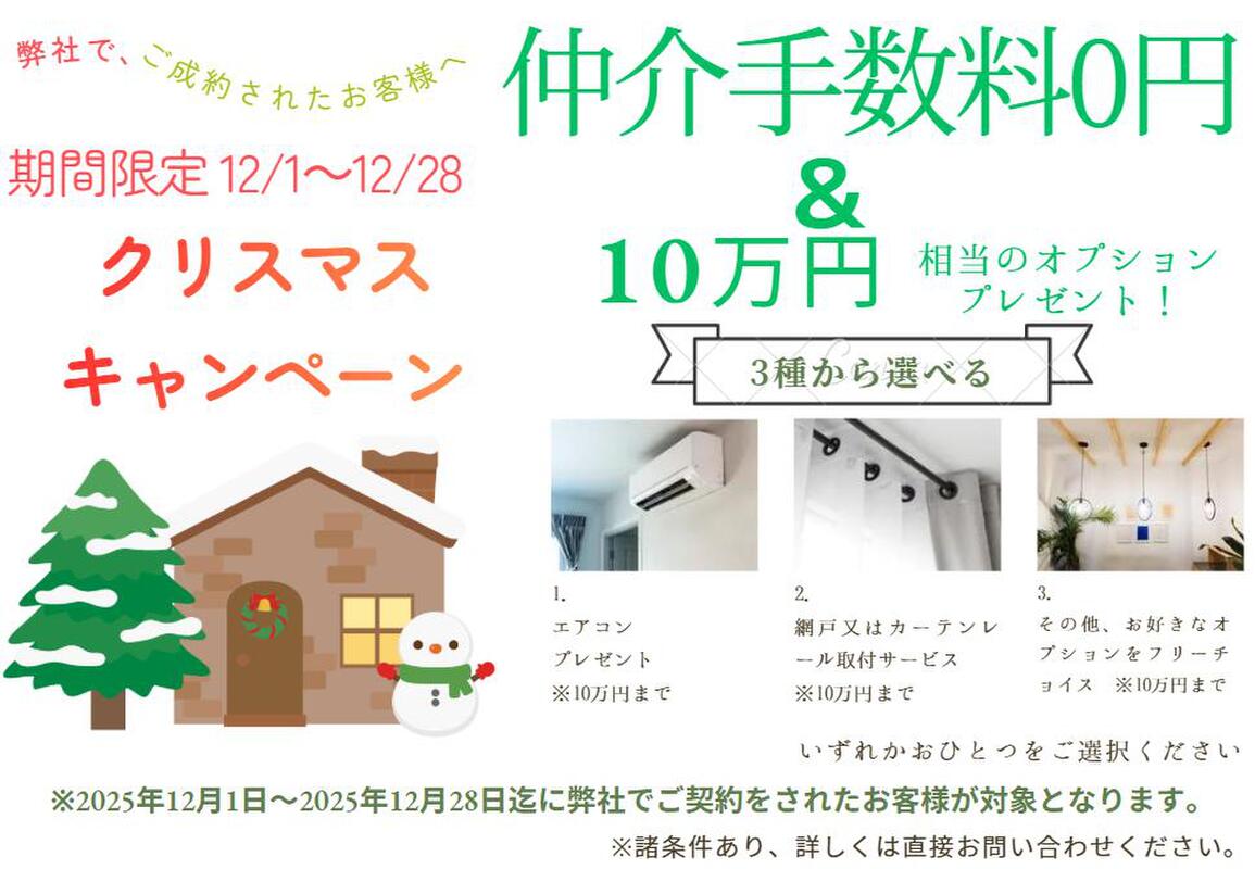 ☆【X’mas企画♪お得なWキャンペーン開催】☆「仲介手数料3%+6万円の消費税が0円」+「選べるオプション15万円分無料サービス」(お好きなオプションをフリーチョイスできます)詳細はお問い合わせください♪※キャンペーン期限は本日より2025年12月28日までに弊社でご成約いただいた方に限ります♪サンタもびっくり!12月限定のBIGセール企画です!少しでもお得に購入されたい方はお気軽にご連絡お待ちしております!