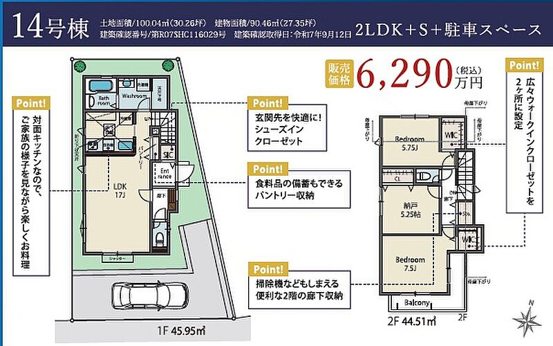 14号棟 間取り 2SLDK+WIC×2+SIC+パントリー 価格 6290万円 建物面積 90.46m2 土地面積 100.04m2 -