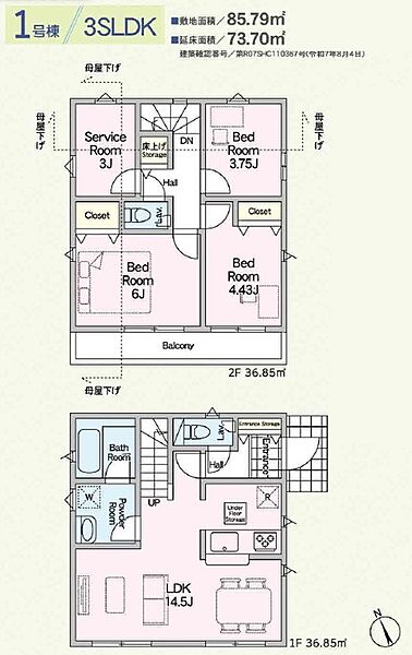 1号棟 間取り 3SLDK 価格 6590万円 建物面積 73.7m2 土地面積 85.79m2