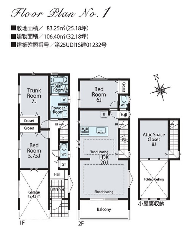 1号棟 間取り 2LDK+S+小屋裏収納 価格 6480万円 建物面積 106.40m2 土地面積 83.25m2