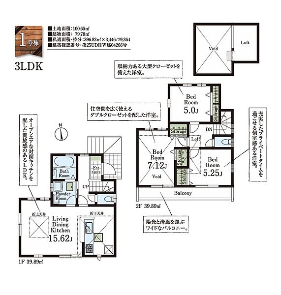 1号棟 間取り 3LDK+ロフト 価格 6780万円 建物面積 79.78m2 土地面積 100.65m2