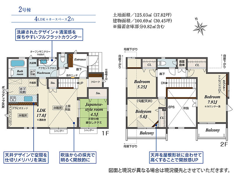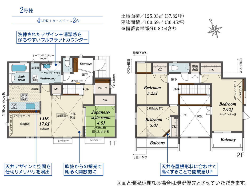 2号棟 間取り 4LDK 価格 6490万円 建物面積 100.69m2(備蓄倉庫部分0.82m2含む) 土地面積 125.03m2