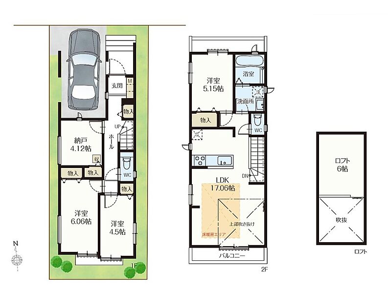 1号棟 間取り 3LDK+S+ロフト 価格 7790万円 建物面積 102.61m2(ビルトイン車庫面積12.87m2含む) 土地面積 84.48m2