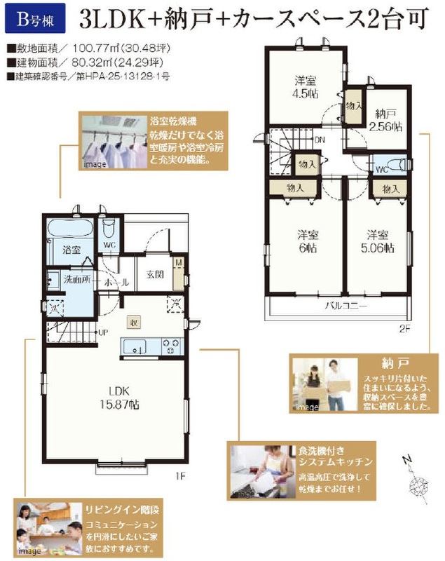 B号棟 間取り 3LDK+納戸 価格 6890万円 建物面積 80.32m2 土地面積 100.77m2 -