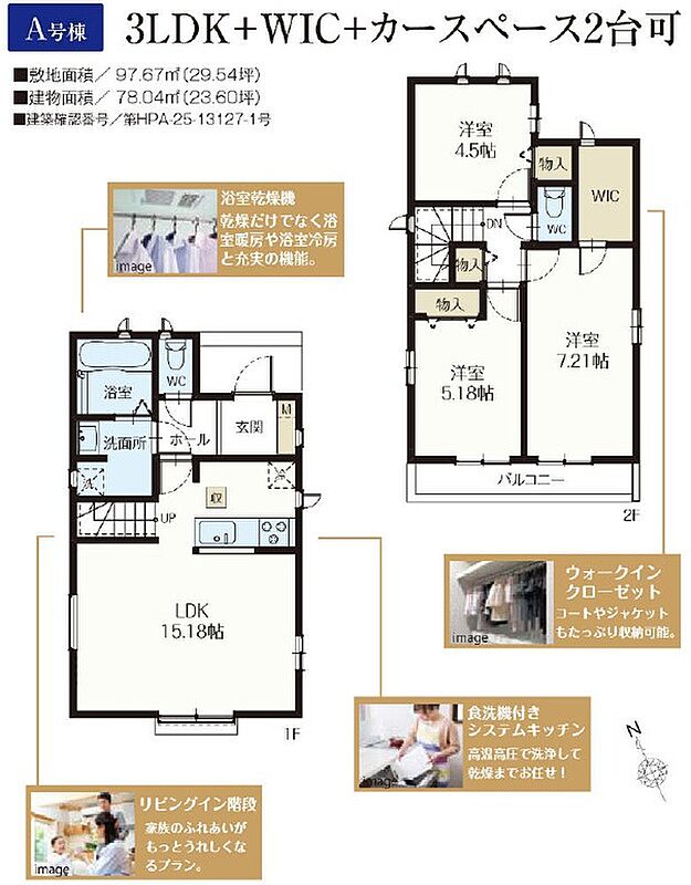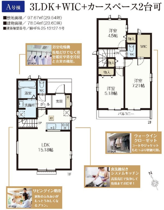 A号棟 間取り 3LDK+WIC 価格 6890万円 建物面積 78.04m2 土地面積 97.67m2