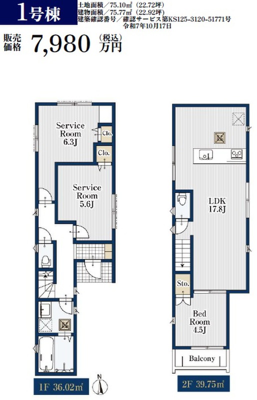 1号棟 間取り 1LDK+2S 価格 7980万円 建物面積 75.77m2 土地面積 75.10m2