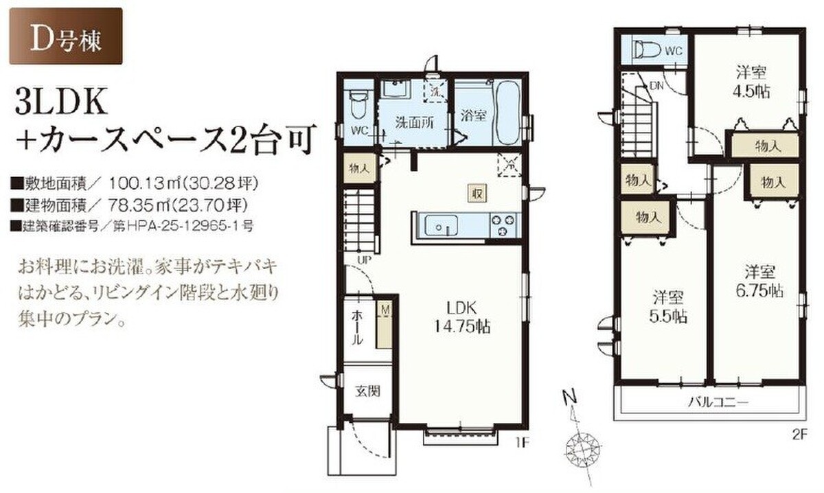D号棟 間取り 3LDK 価格 6290万円 建物面積 78.35m2 土地面積 100.13m2 -