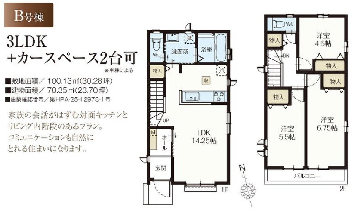 B号棟 間取り 3LDK 価格 6390万円 建物面積 78.35m2 土地面積 100.13m2 -