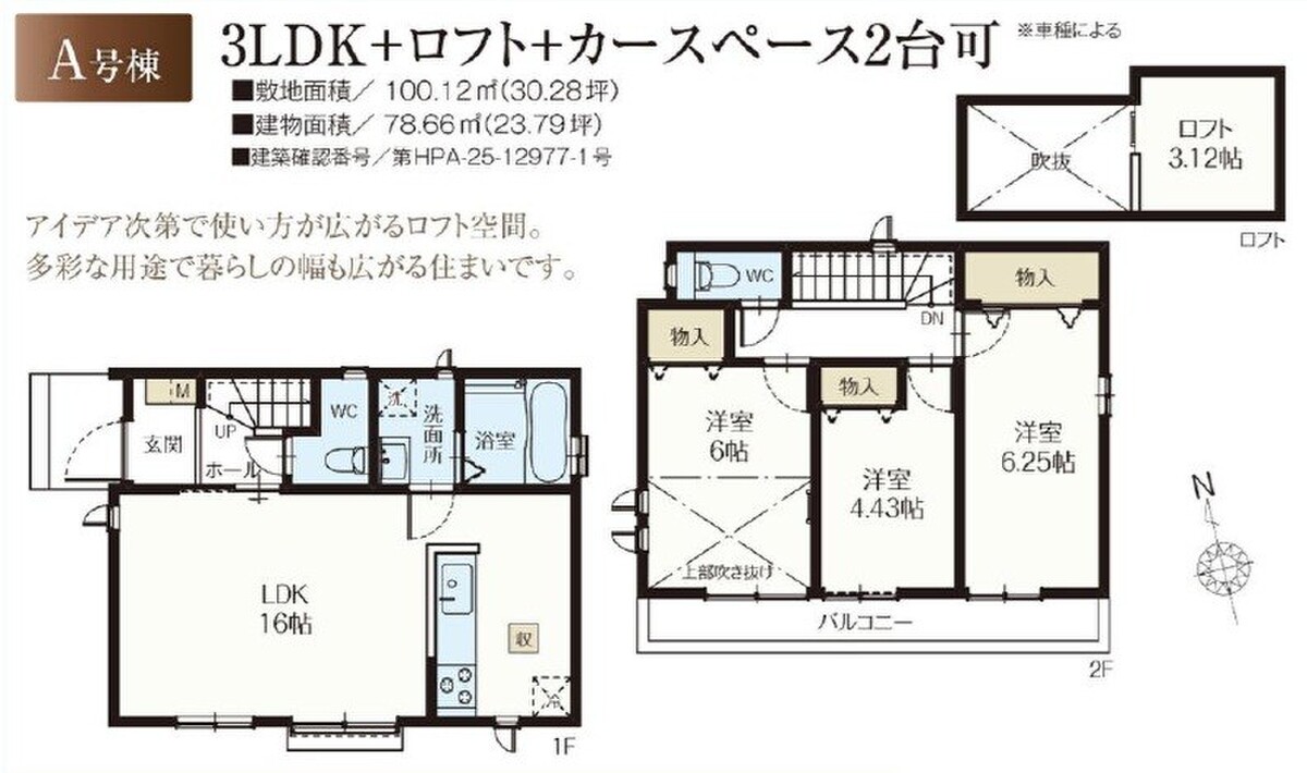 A号棟 間取り 3LDK+ロフト 価格 6890万円 建物面積 78.66m2 土地面積 100.12m2