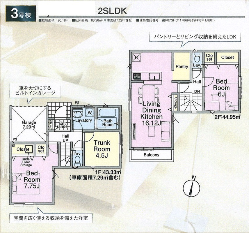 3号棟 間取り 2SLDK+パントリー 価格 6580万円 建物面積 88.28m2(車庫面積7.29m2含む) 土地面積 90.18m2