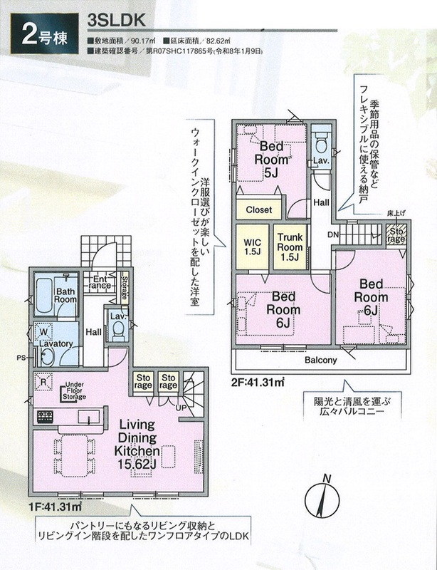 2号棟 間取り 3SLDK+WIC 価格 6880万円 建物面積 82.62m2 土地面積 90.17m2 -