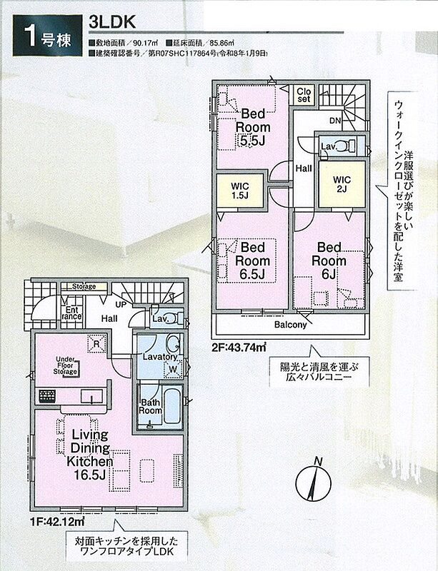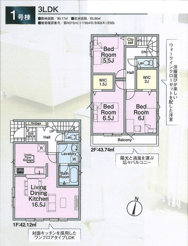 1号棟 間取り 3LDK+2WIC 価格 6980万円 建物面積 85.86m2 土地面積 90.17m2 -