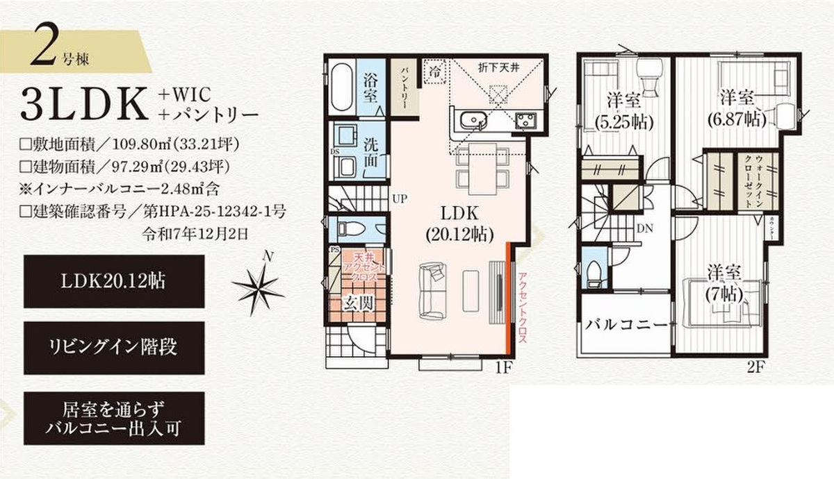 2号棟 間取り 3LDK+WIC+パントリー 価格 7980万円 建物面積 97.29m2(インナーバルコニー2.48m2含む) 土地面積 109.80m2 -