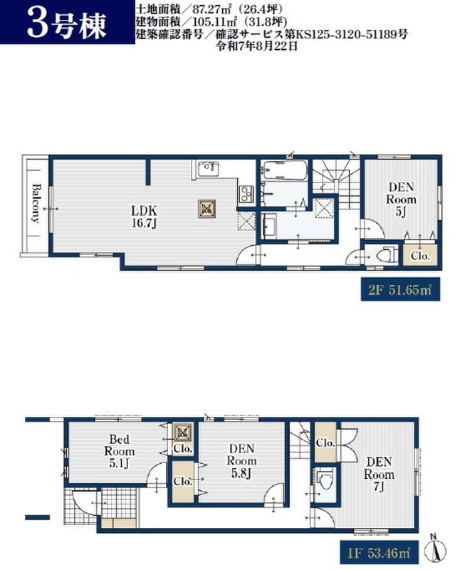 3号棟 間取り 1LDK+3S 価格 4480万円 建物面積 105.11m2 土地面積 87.27m2