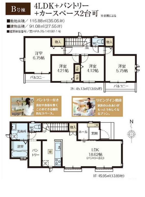 B号棟 間取り 4LDK+パントリー 価格 6790万円 建物面積 91.08m2 土地面積 115.88m2 -