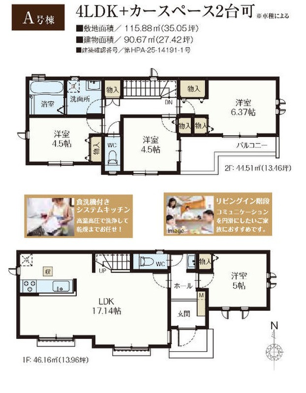 A号棟 間取り 4LDK 価格 6690万円 建物面積 90.67m2 土地面積 115.88m2 -