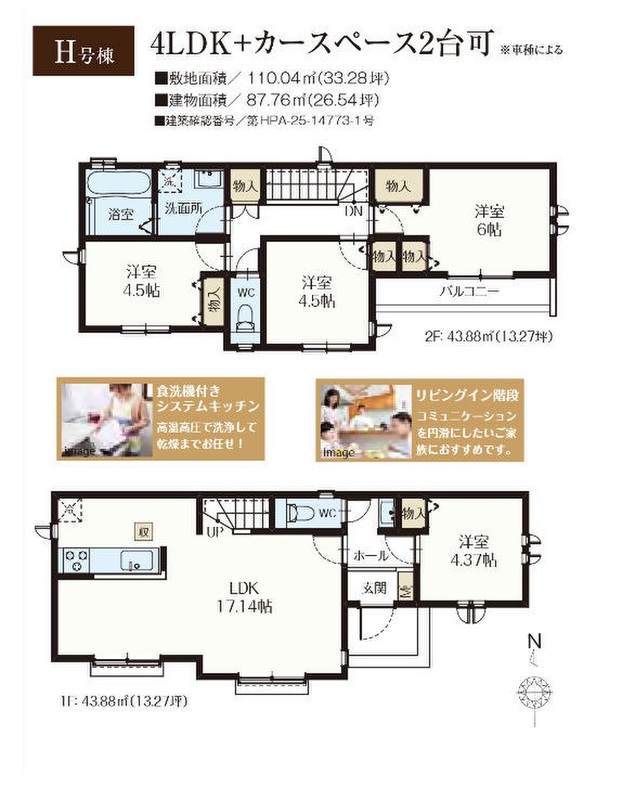 H号棟 間取り 4LDK 価格 6490万円 建物面積 87.76m2 土地面積 110.04m2 -