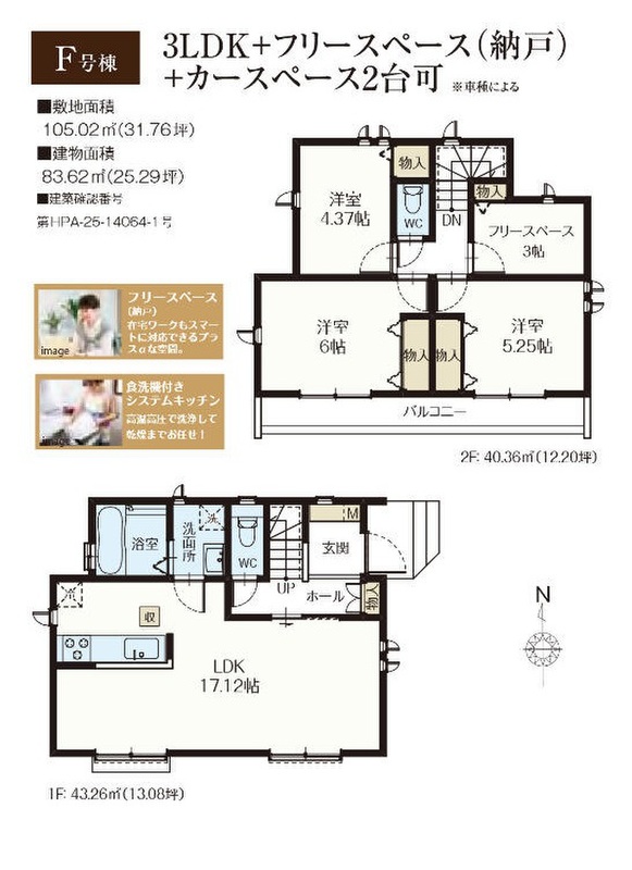 F号棟 間取り 3LDK+S 価格 6590万円 建物面積 83.62m2 土地面積 105.02m2 -