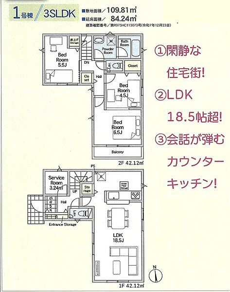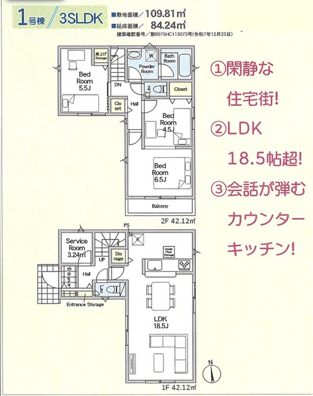 1号棟 間取り 3SLDK 価格 6590万円 建物面積 84.24m2 土地面積 109.81m2