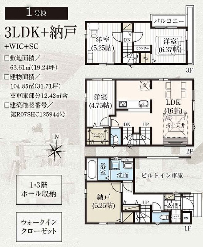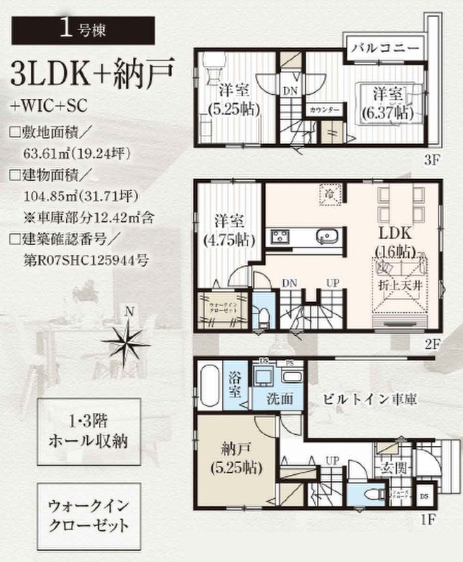 1号棟 間取り 3SLDK+WIC+SC 価格 5190万円 建物面積 104.85m2(車庫部分12.42m2含む) 土地面積 63.61m2