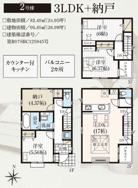 2号棟 間取り 3SLDK 価格 4590万円 建物面積 95.85m2 土地面積 82.49m2 -